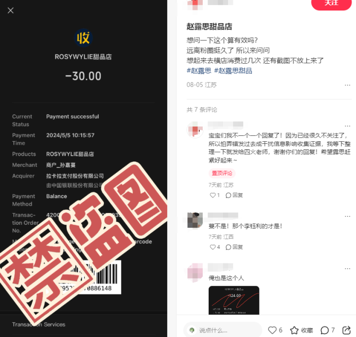 值得注意的是,有网友晒出自己在赵露思“ROSYWYLIE甜品店”的付款记录,图片显示商户全称为“商户_孙嘉蔓”。