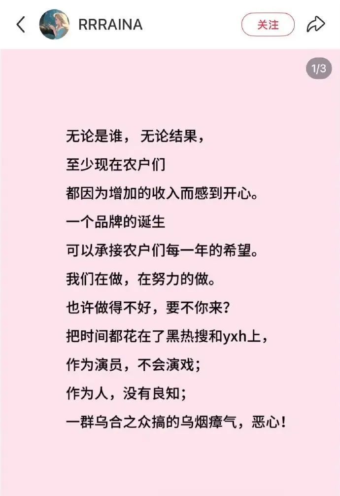 对此,赵露思闺蜜发文回应:“至少现在农户们都因为增加的收入而感到开心。一个品牌的诞生,可以承接农户们每一年的希望。我们在做,在努力地做。也许做得不好,要不你来?”